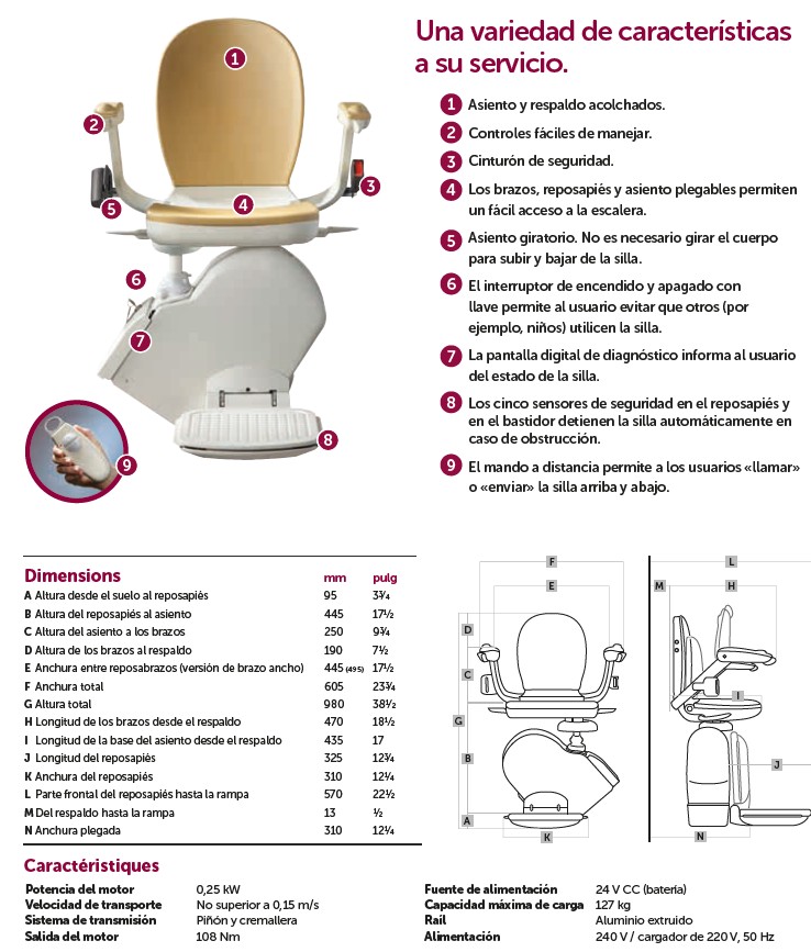 Se trata de un sistema práctico y seguro que permite subir y bajar las escaleras sin esfuerzo y con absoluta tranquilidad. Este modelo destaca por su construcción robusta y por la atención minuciosa a cada detalle, con el objetivo de proporcionar confort, estabilidad y tranquilidad al usuario en cada trayecto.